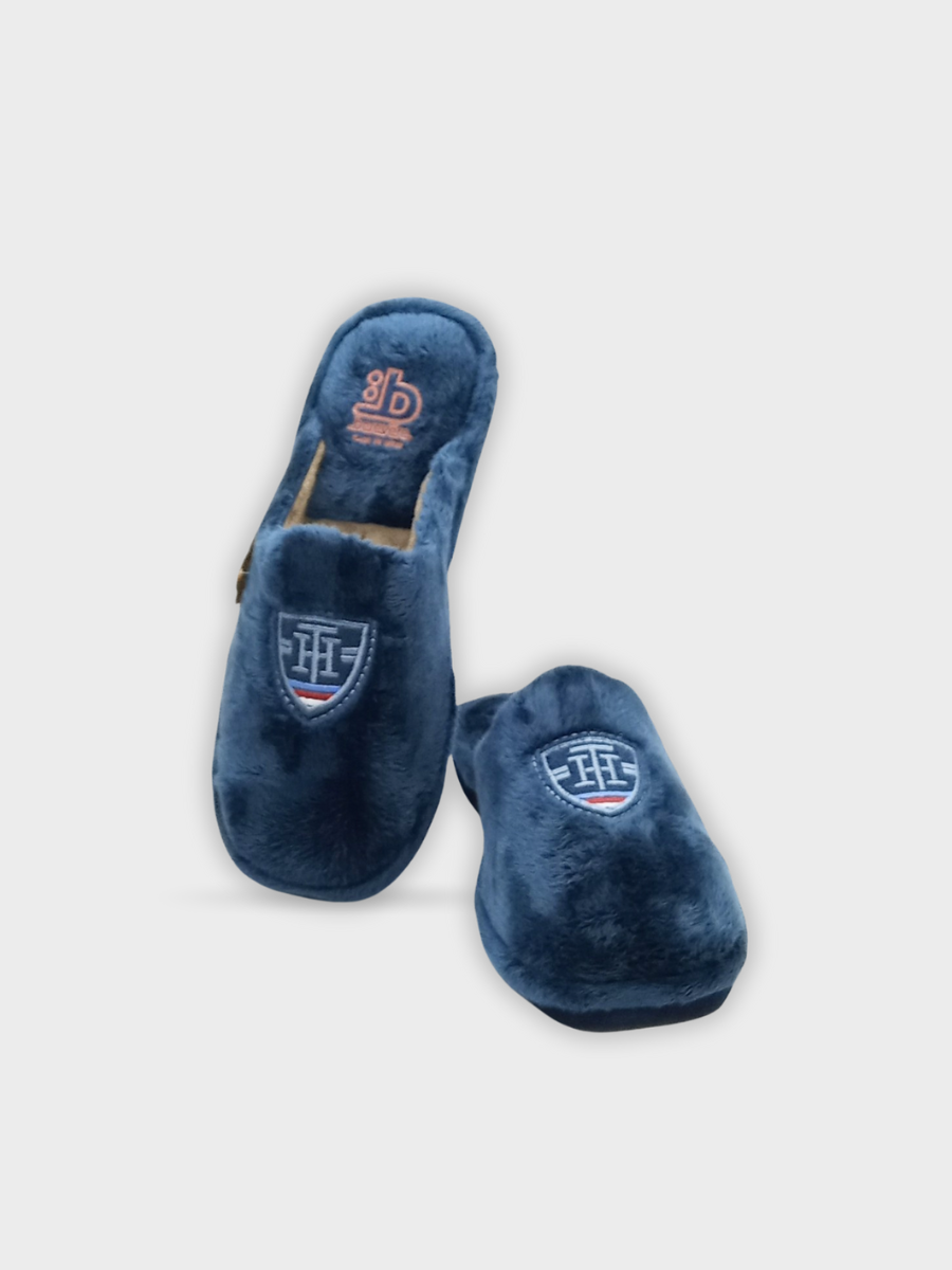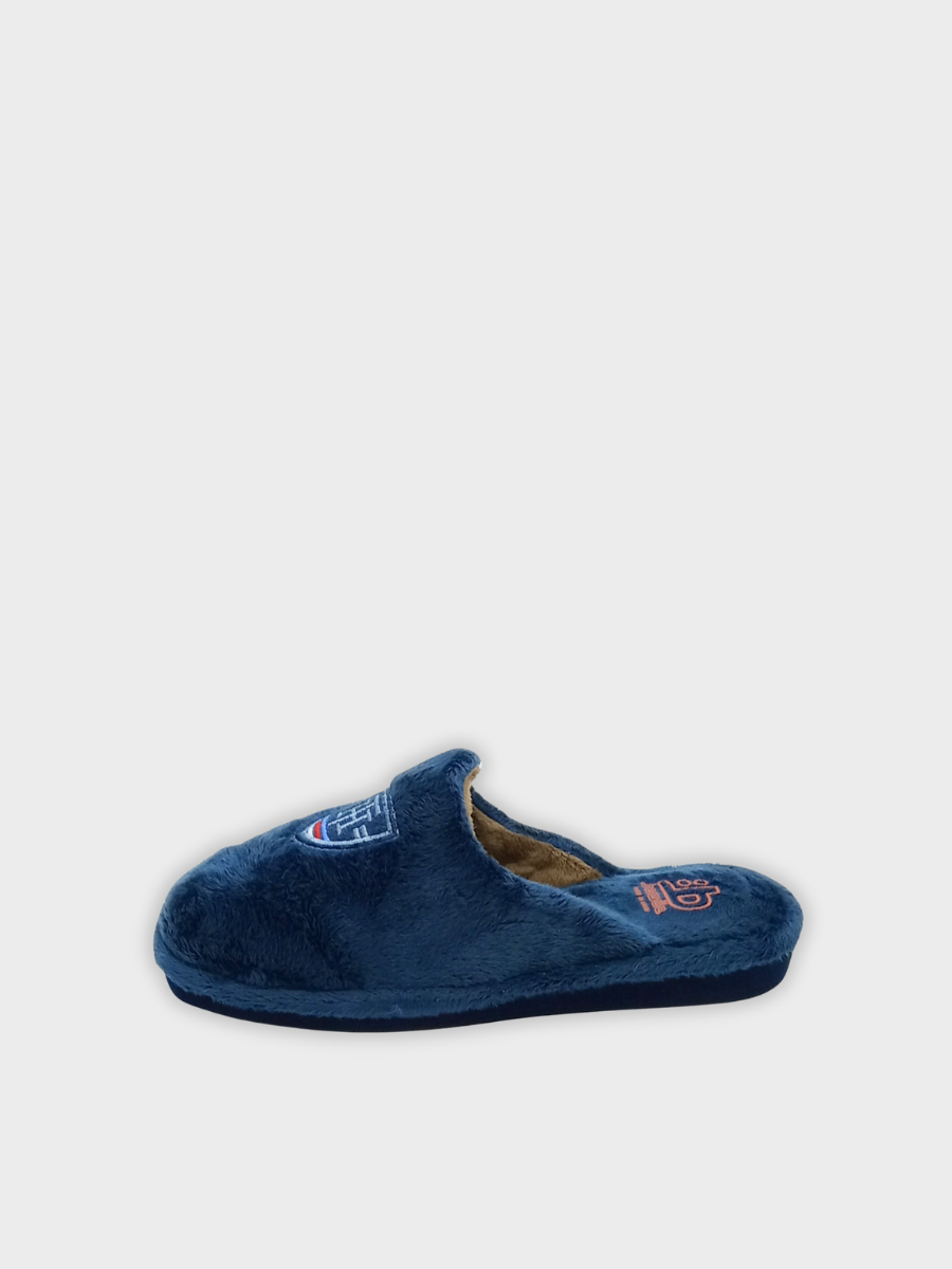 - Zapatilla para hombre de estar por casa con motivo bordado ¨-Escudo-. Zapatilla cálida y muy confortable en color marino y talonera abierta.