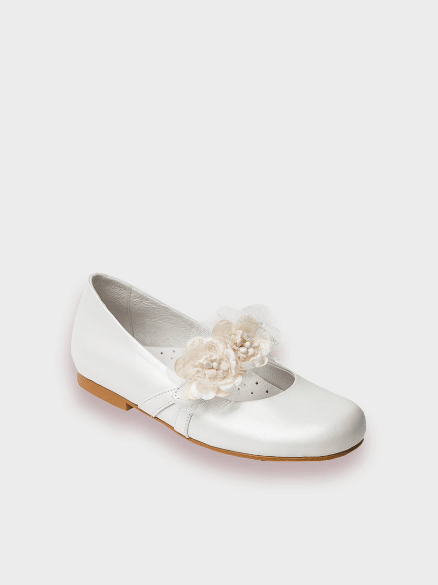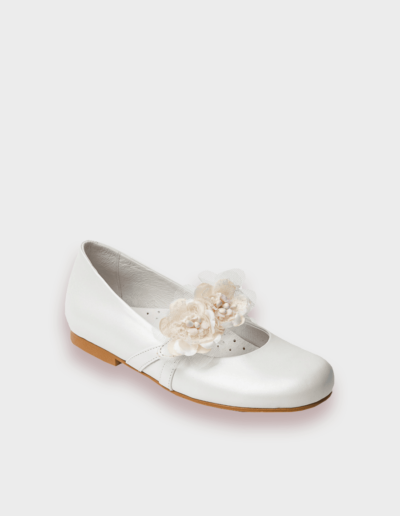 Zapato de comunión para niña en piel con adorno floral de quita y pon. Plantilla en piel perforada para una mejor aireación. El lazo se coge a través de la correa con un imperdible para tener la opción de dejarlo con adorno o liso . Fabricado en España. Disponible en Nacarado Blanco y Nacarado Beig.